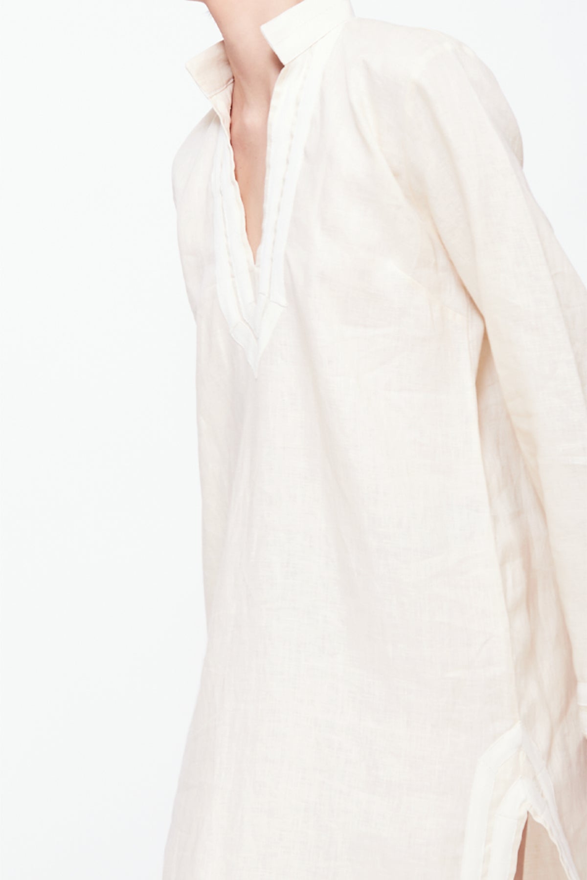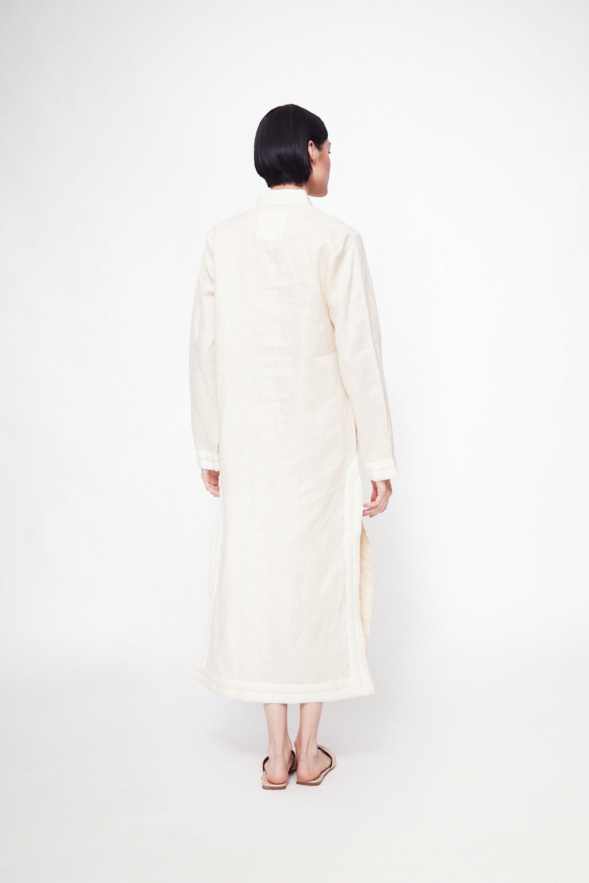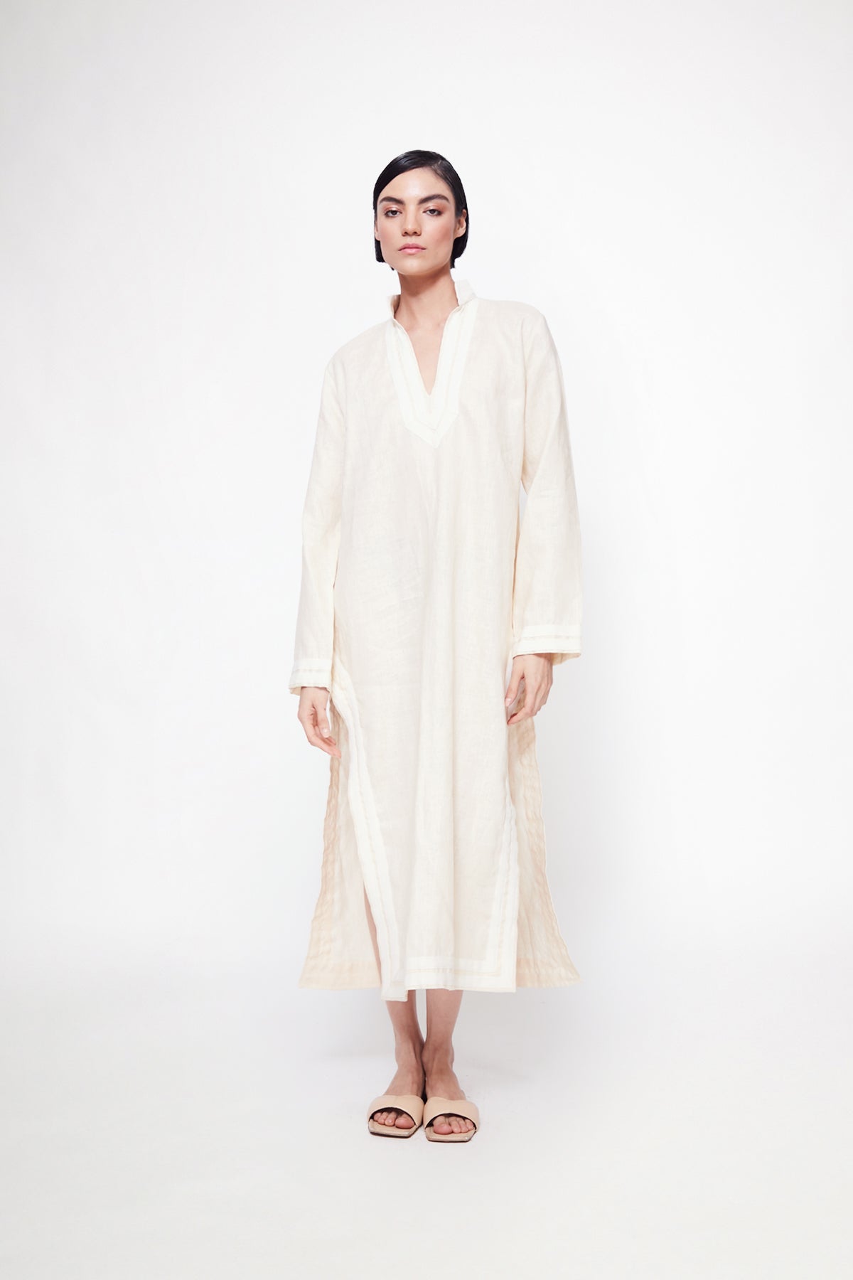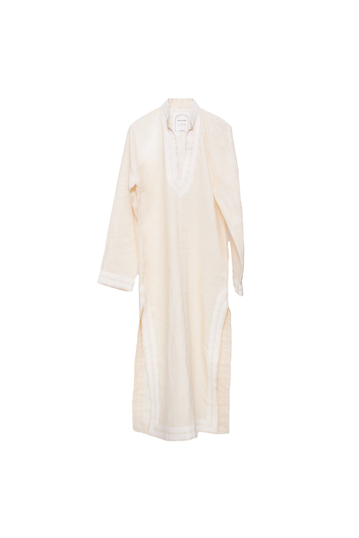 Bata de lino color beige con detalles color hueso.