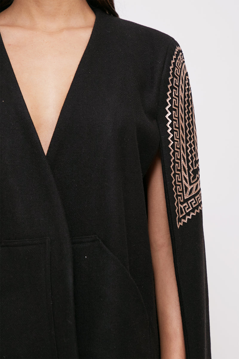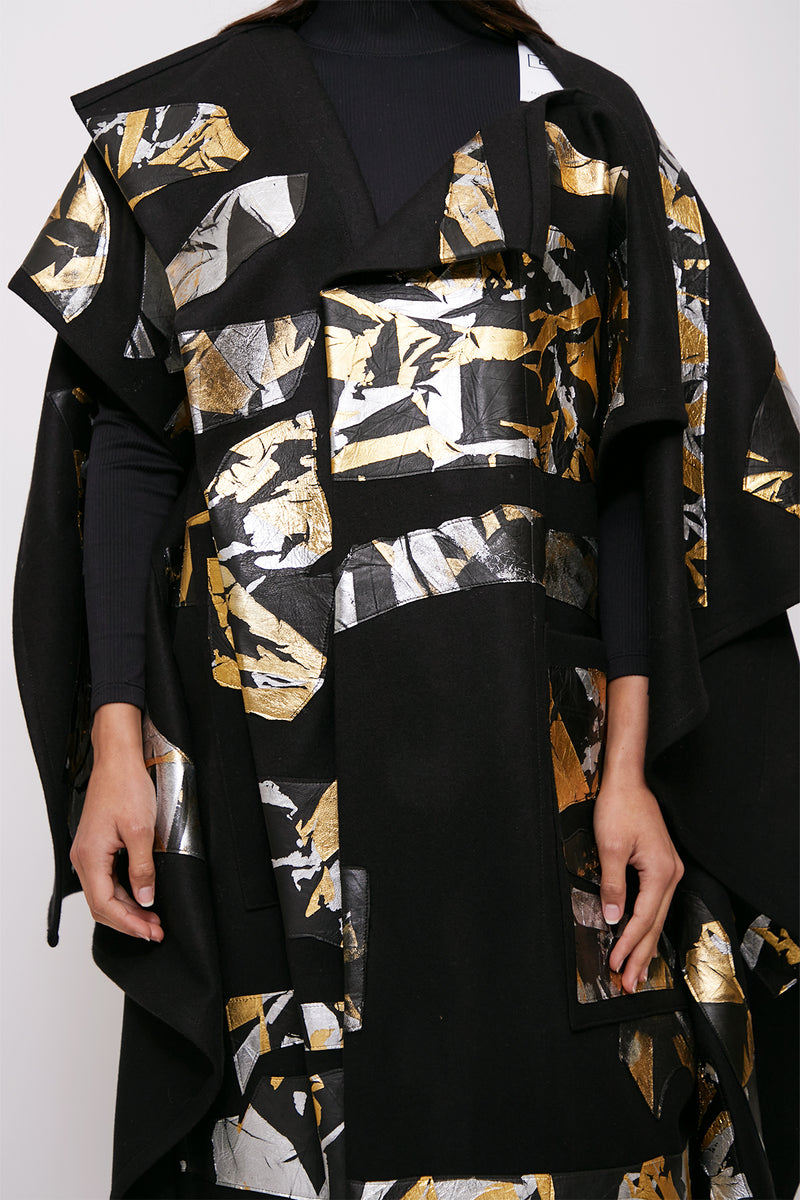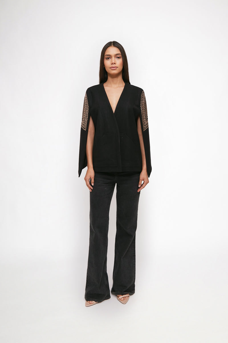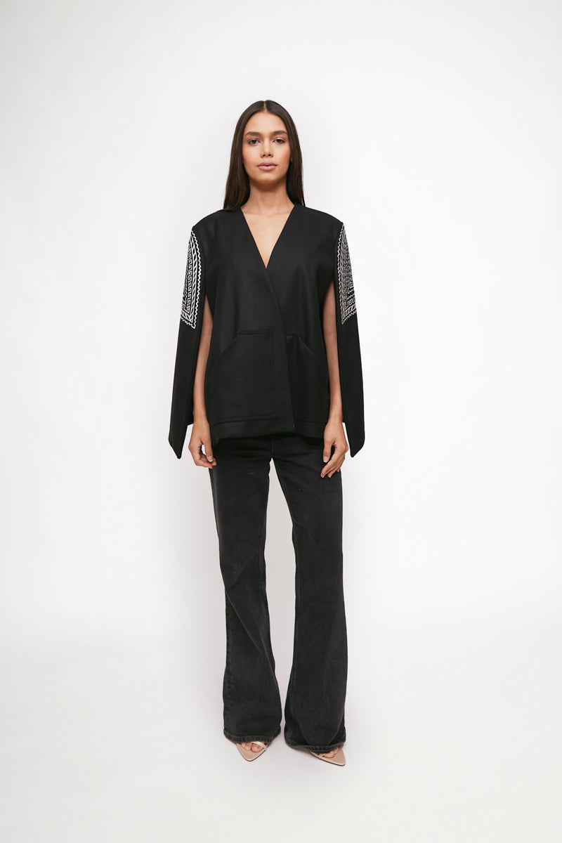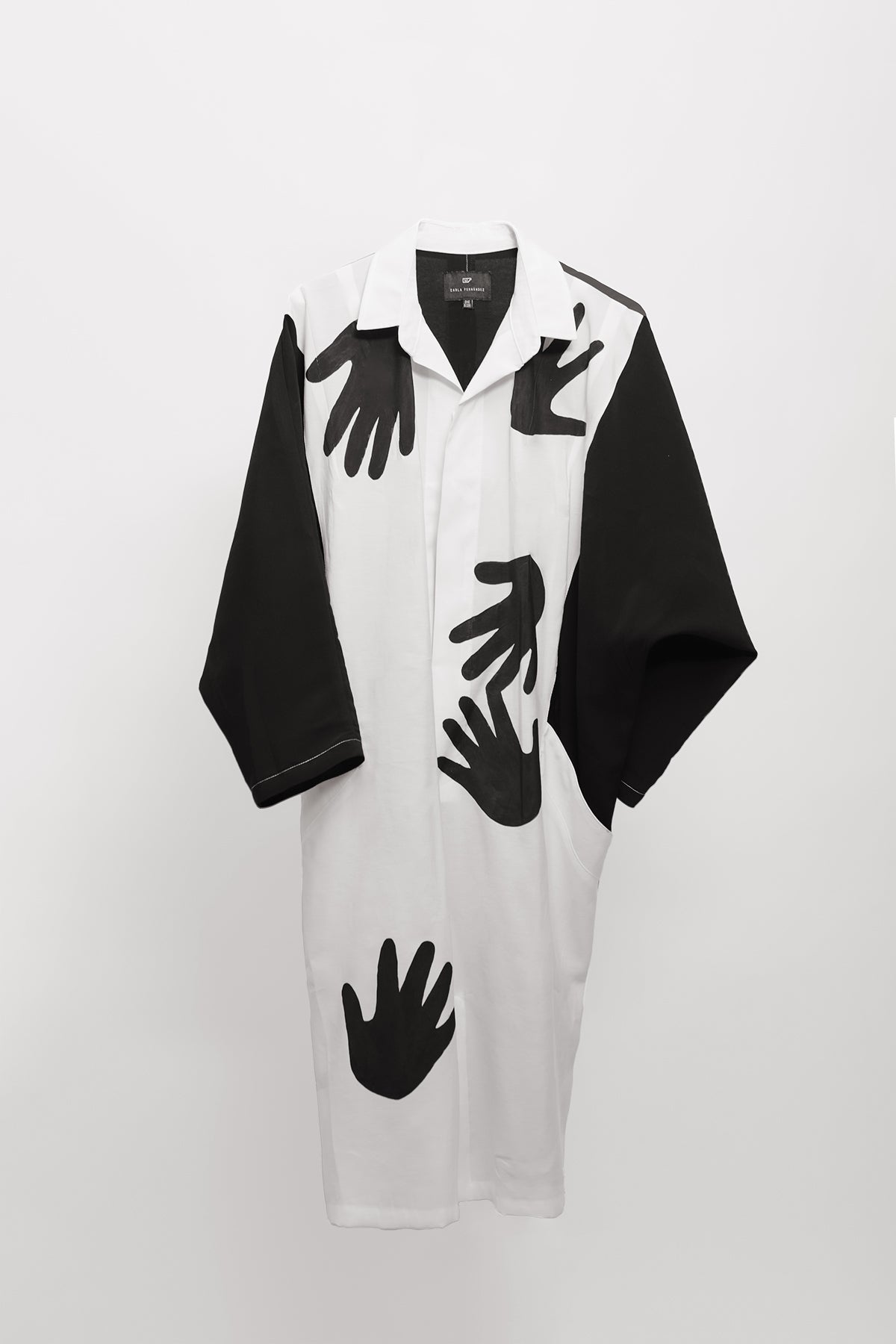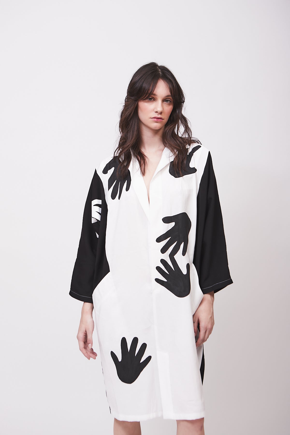 Blusón bicolor, con cuello camisero, talle delantero con pinzas en hombros, cortes verticales para seccionar talle y sisa, manga 3/4. Pintado a mano por artesanos de CDMX.