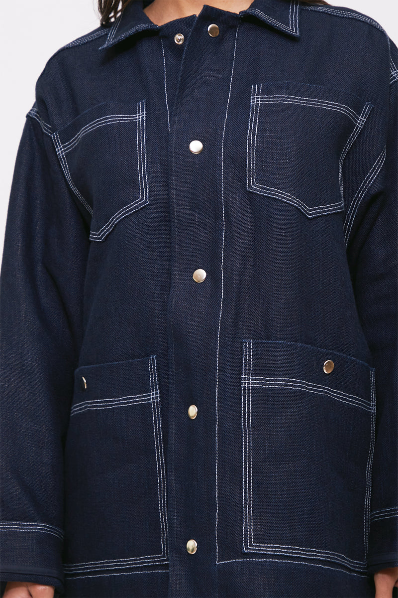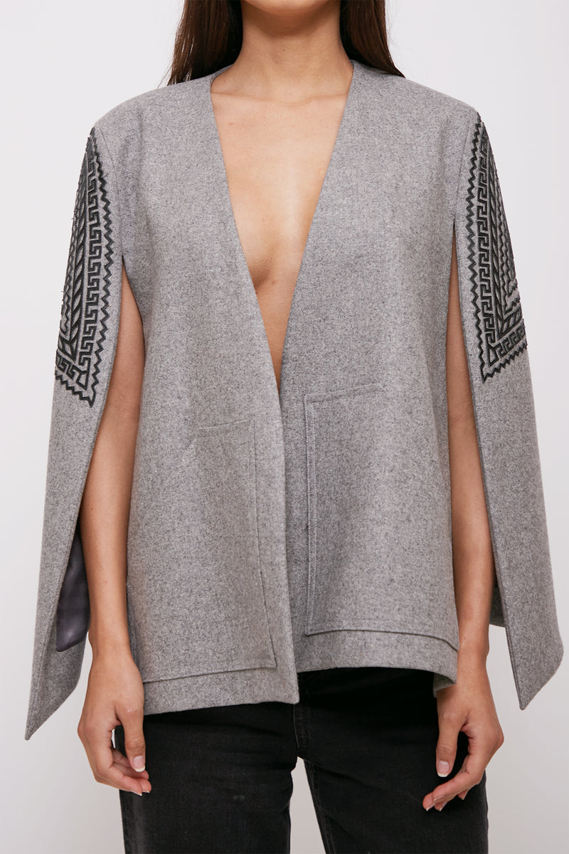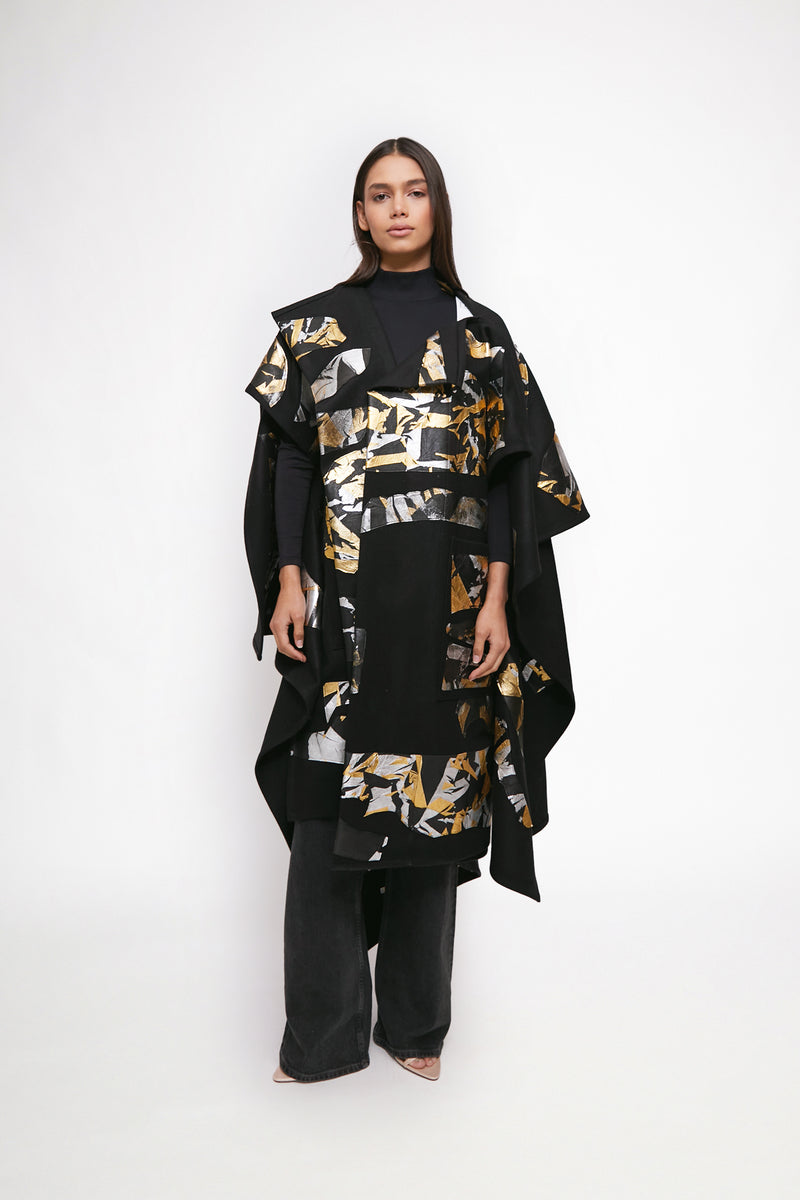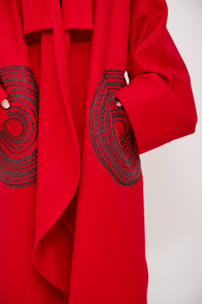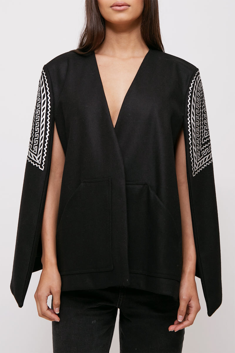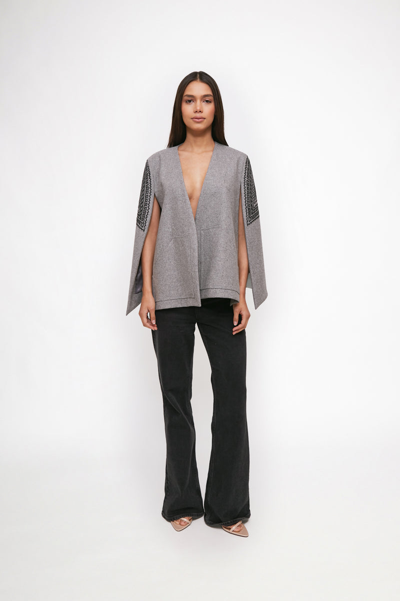 Blusón bicolor, con cuello camisero, talle delantero con pinzas en hombros, cortes verticales para seccionar talle y sisa, manga 3/4. Pintado a mano por artesanos de CDMX.