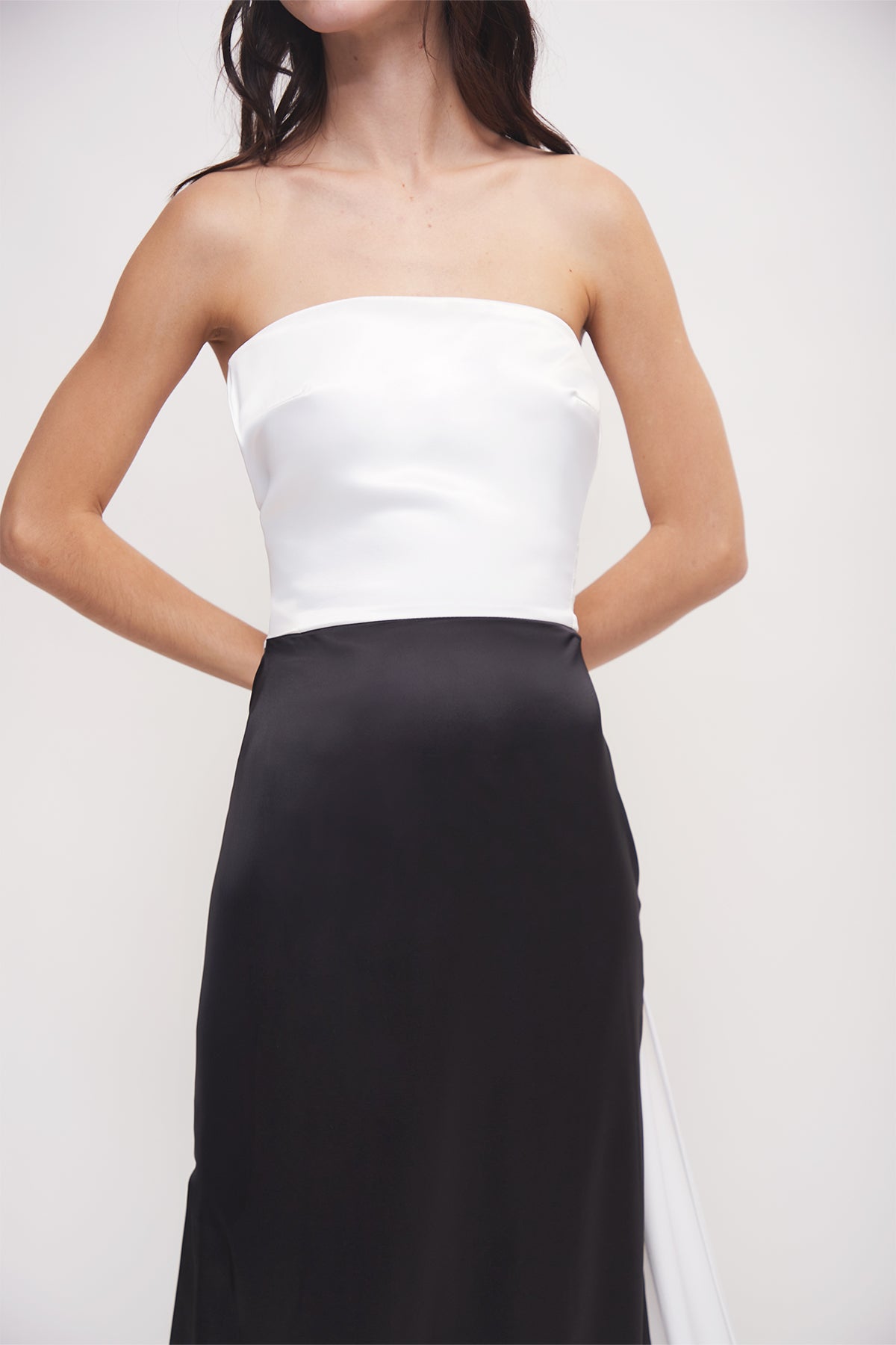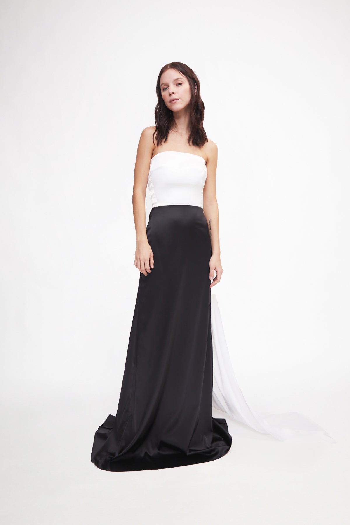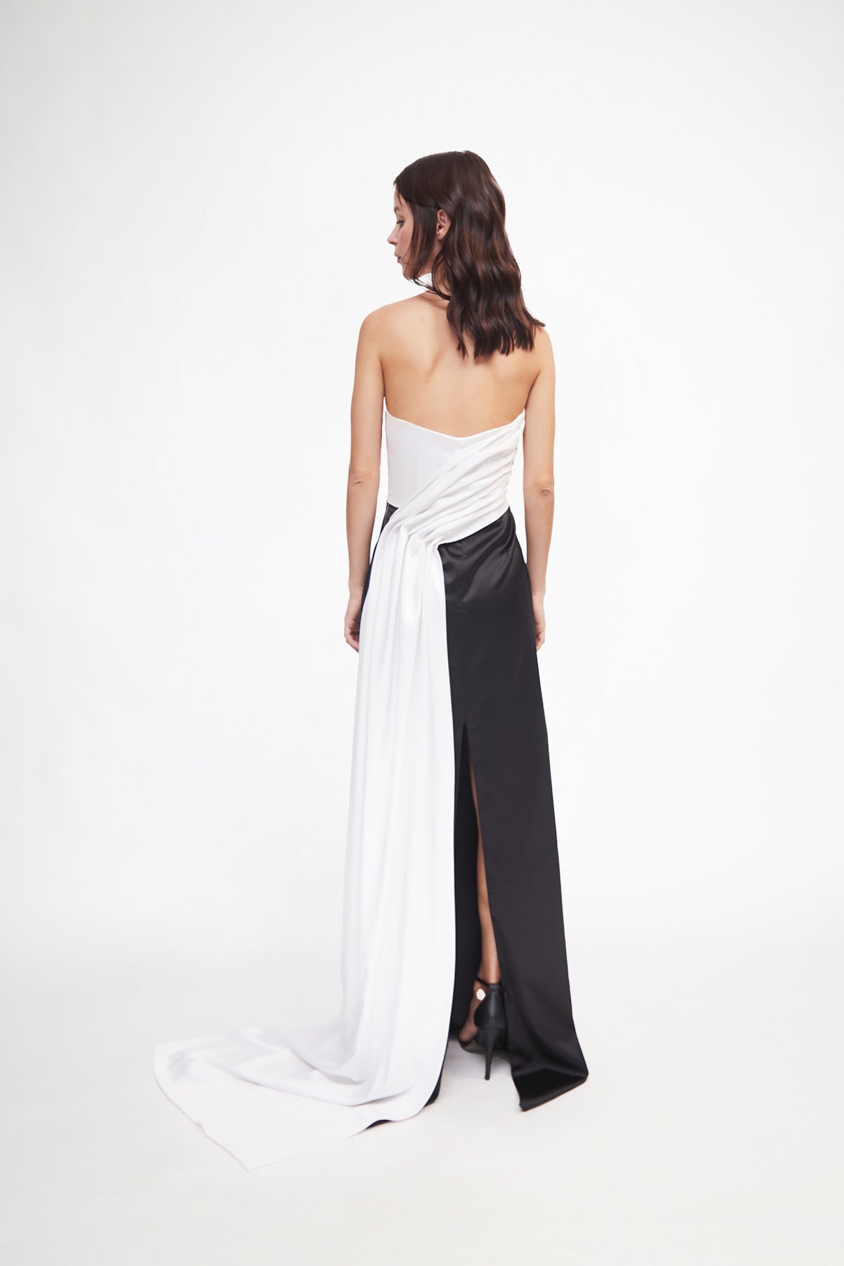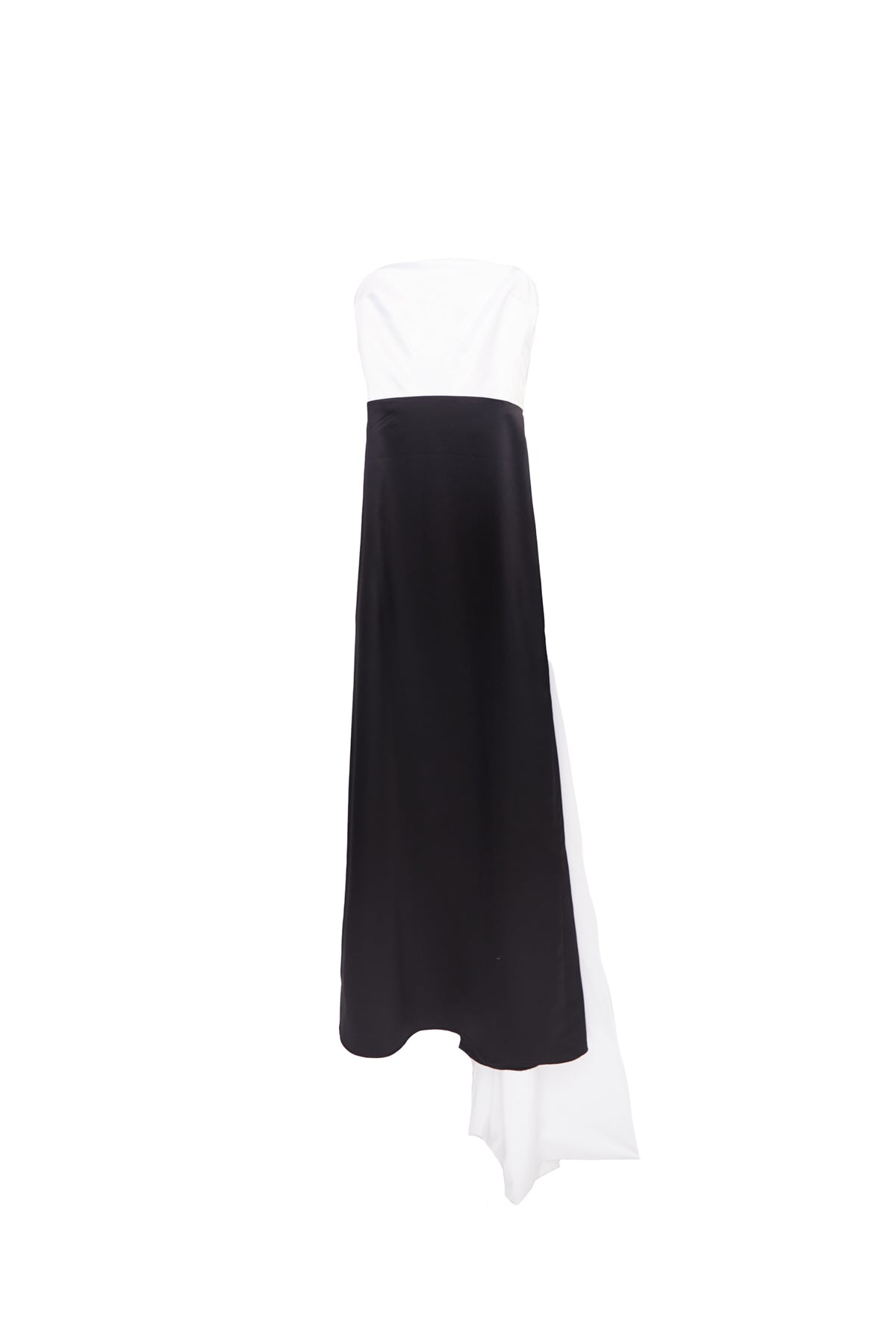 Vestido largo blanco con negro con detalle de cola en parte trasera.