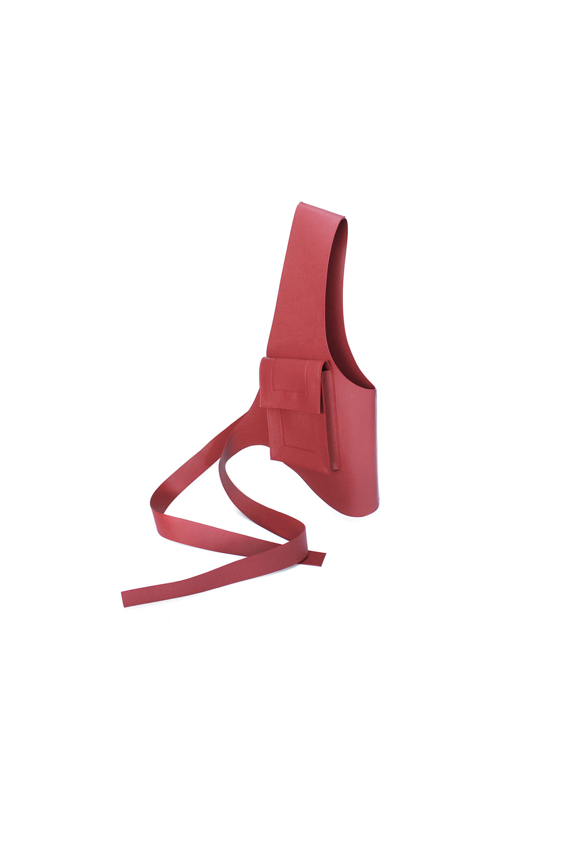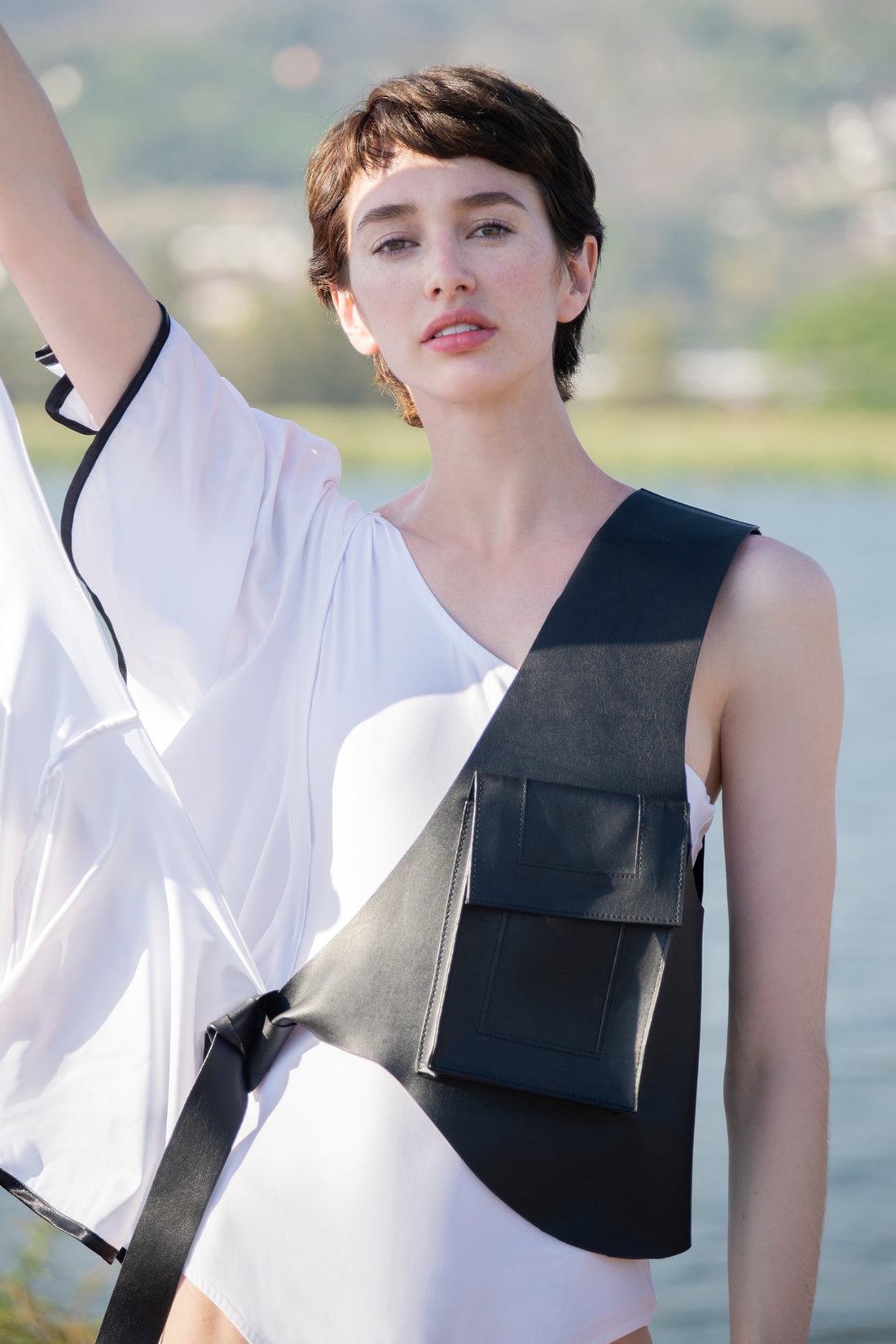 Bolso chaleco ajustable con tirantes largos que se atan a la cintura. Bolsa frontal con cierre de imán. Talla única y sin género.