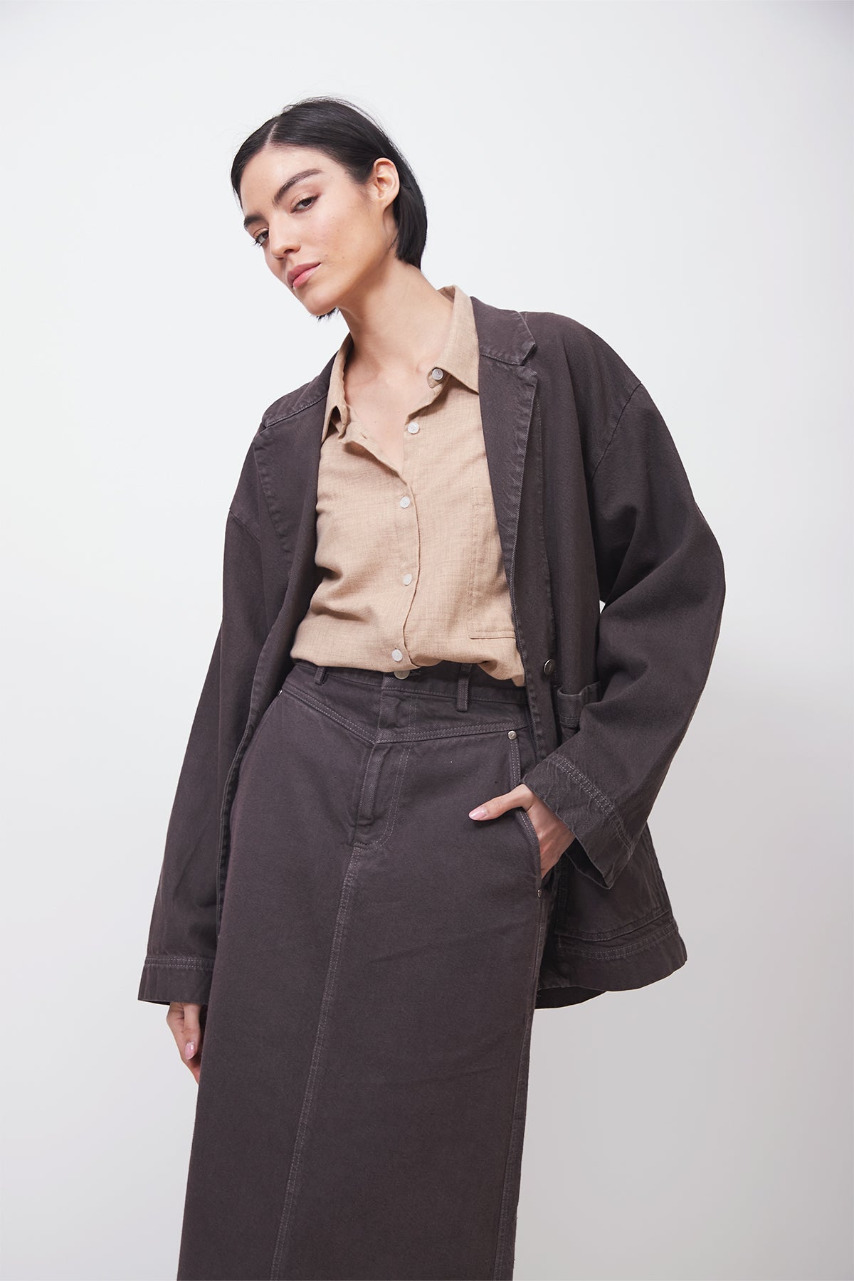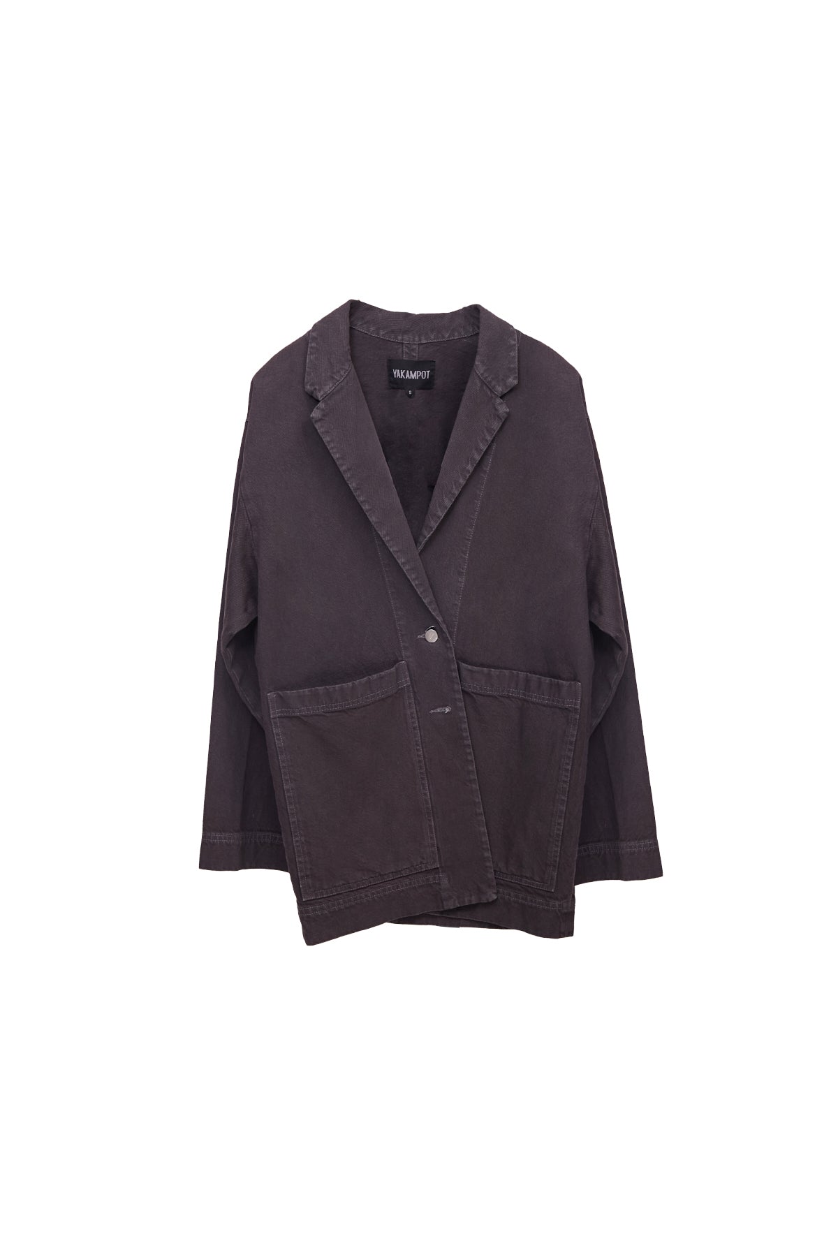Saco oversize de mezclilla fabricada por productores locales. Silueta recta, manga larga, cuello y solapas tipo esmoquin. Con bolsillos de parche extra grandes al frente. Sin forro.